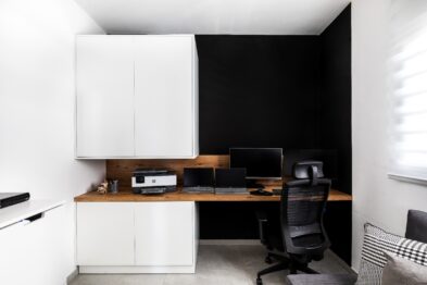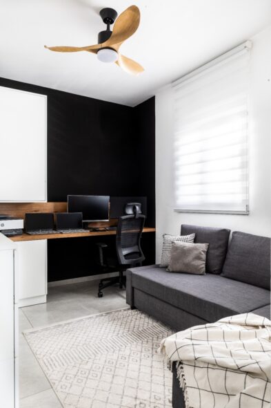 מיטל ובעלה עובדים היברדי גם מהבית ולכן היה חשוב לתכנן ולעצב עבורם גם חדר עבודה שיהיה פונקציונלי ויהווה את הפינה המושלמת לעבודה מהבית.