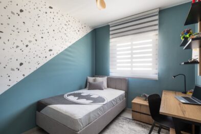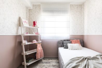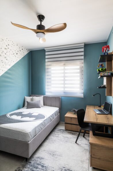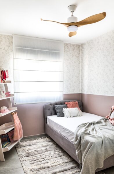 בהחלטה בנוגע לגווני הצבע לקיר, שיתפתי את הילדים בבחירת הטפט בכדי לתת להם תחושה שהם חלק. עבור הבן תכננתי בחדר שולחן ללימודים ולגיימינג, ומדפים צפים ואילו עבור הבת בחרנו גוונים של ורוד עתיק וכן נבחר ריהוט בהיר שמשרה אווירה רגועה ונעימה בחדר.