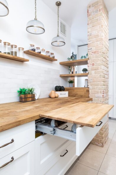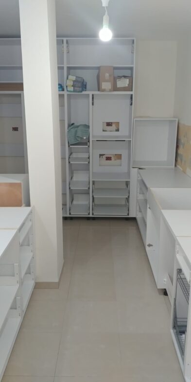 כך עשיתי גם הפעם, המטבח של המשפחה הינו צר וארוך, אם המשפחה ביקשה אופציה לבשל בישיבה, ולכן יצרתי בוצ'ר שנראה כמו מגירה ונפתח למשטח עליון מתחתיו ניתן למקם כיסא ולבשל בישיבה.